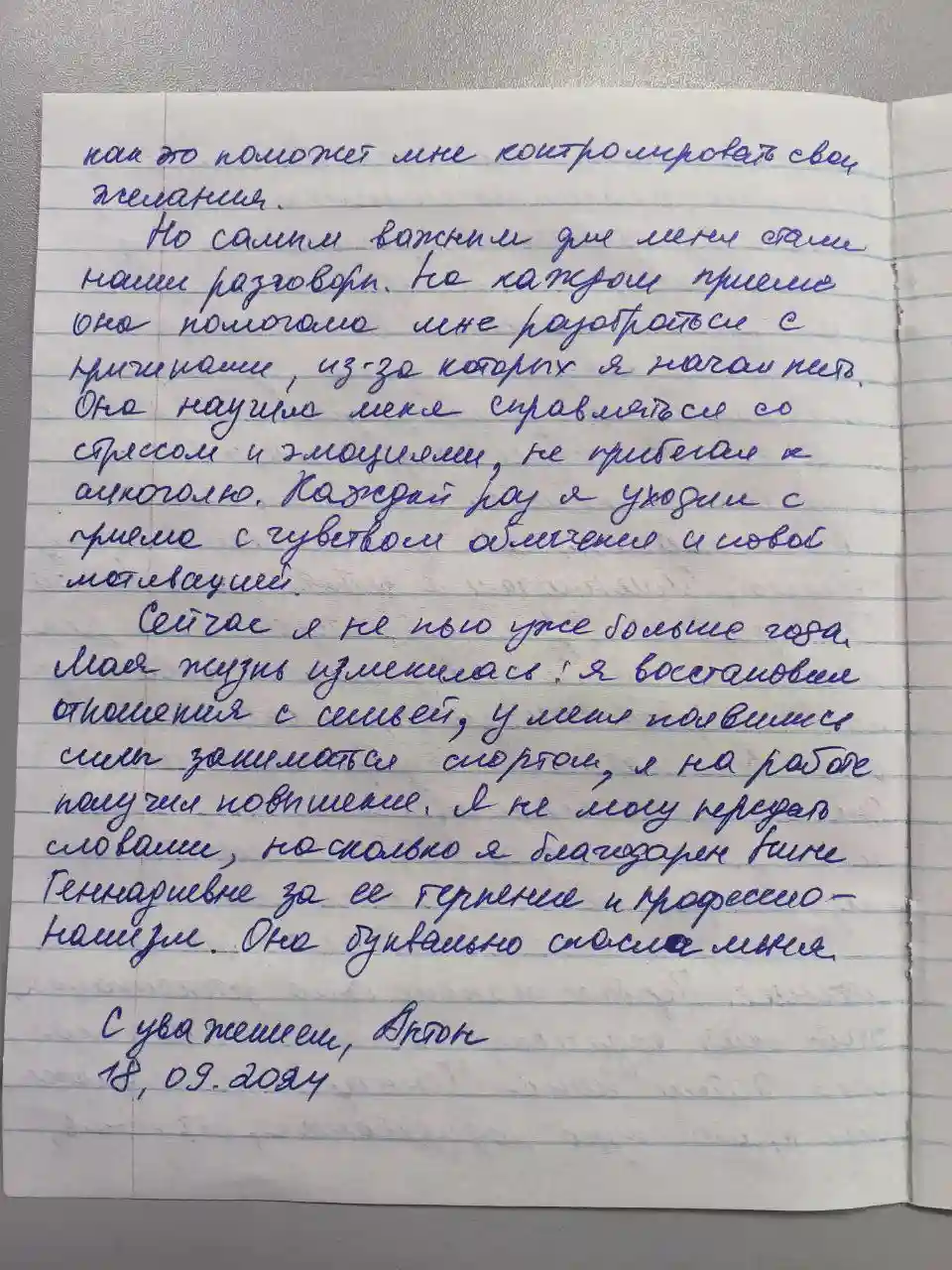 Сейчас я не пью уже больше года. Моя жизнь изменилась: я восстановил отношения с семьёй, у меня появились силы заниматься спортом, а на работе я получил повышение. Я не могу передать словами, насколько я благодарен Нине Геннадиевне за её терпение и профессионализм. Она буквально спасла меня.